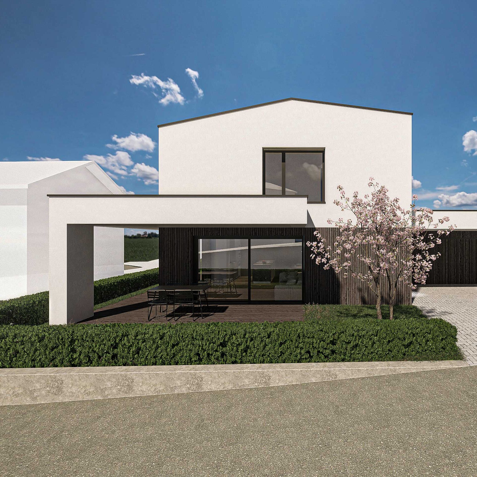 Das Gebäude zeigt sich als selbstbewusster, zurückhaltender Baukörper mit klarer Gliederung. Horizontale Linien dominieren das Bild, unterstützt durch ein elegantes Zusammenspiel aus weissen Putzflächen und vertikal strukturierten Holzfassadenelementen. Die Proportionen sind bewusst gewählt, um dem Haus eine ruhige, zeitlose Präsenz zu verleihen.